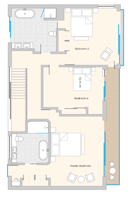 Allow nature to set the pace as you gently stir in this stunning bedroom, the dawn chorus your only alarm clock. Slide open the door to reveal peaceful garden views, with direct access to the stone terrace and sloped lawn, leading to the garden room office. Soft, sandy-toned carpet and a neutral decor create a calming space to drift off in picturesque surroundings. This room has six foot zip and link beds which can be arranged to suit guest requirements.